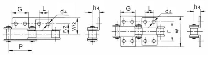常用雙節(jié)距輸送鏈以及彎附板(雙孔)的尺寸。(單位:mm) |